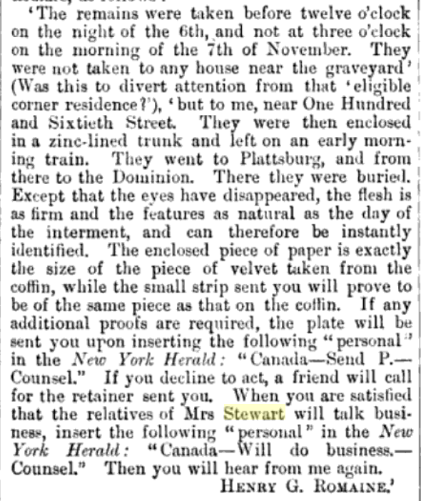 Mrs. Stewart yielded and just like that, the antsy body-snatchers made their first move in January, one year later. In a Canadian-postmarked letter addressed to Patrick H. Jones, a New York attorney and signed by a Henry G. Romaine, the writer asked for the return of Stewart’s body in exchange for $200,000 and for Romaine to mediate the matter. The letter also promised, alongside Stewart’s body, a $100 bill “by way of retaining fee to General Jones,” if he would agree to help out. To prove that Romaine was no impostor, the letter also provided details of the body-snatching: