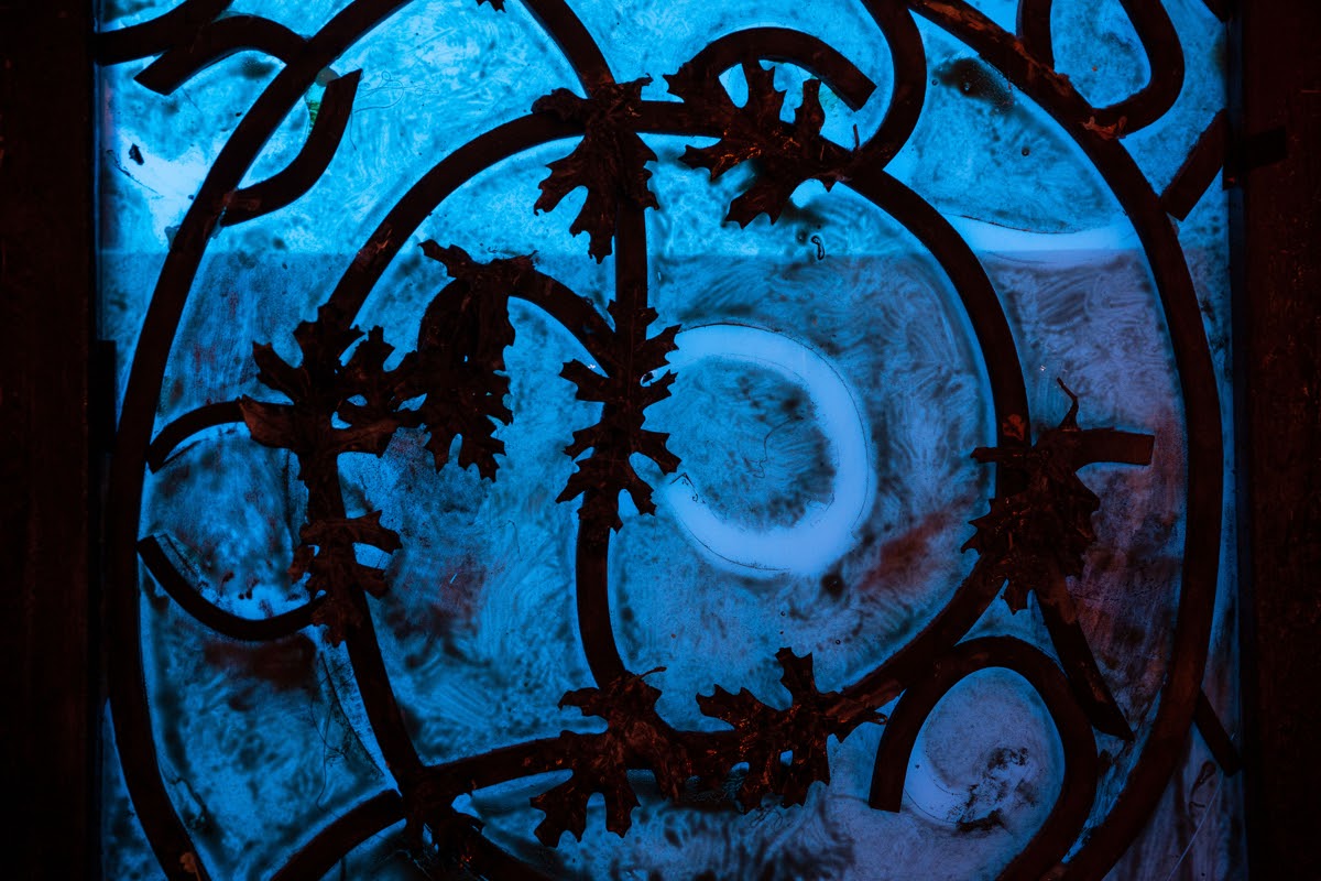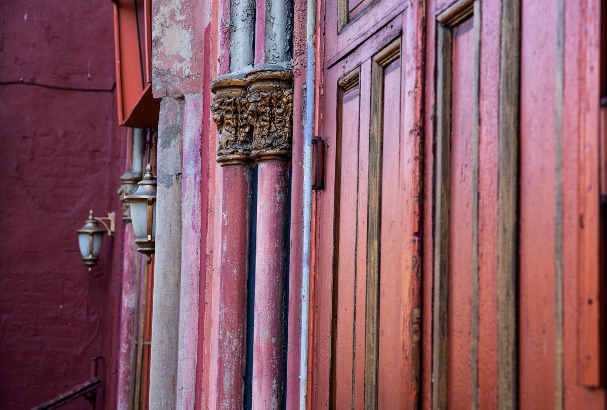 The synagogue’s brick red and rose-painted stucco walls rise between tenement apartment buildings. These days Orensanz’s yellow, red, and green cylindrical metal sculptures adorn the front steps, which have been painted in the same yellow, red, and green of the sculptures. Coppery metallic paint shimmers on the doors, and a portrait of Angel Orensanz hangs above the main entrance. In the expansive Gothic window high above the street, the panes form the Star of David. On smaller windows flanking either side of the centerpiece, someone has painted faint human figures, some of them playing musical instruments, onto the glass.