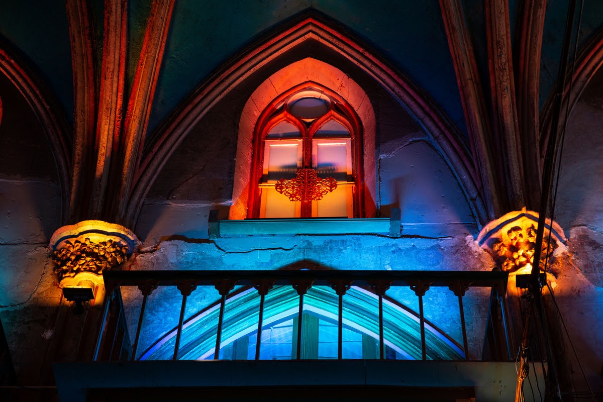 Under the deep blue rib vault ceiling inside, workers busily arrange a sound system and set up tables and chairs for an evening event. Roberto Santiago, director of Orensanz Events, rushes to and fro, giving direction while fielding the visitors who wander into the building.