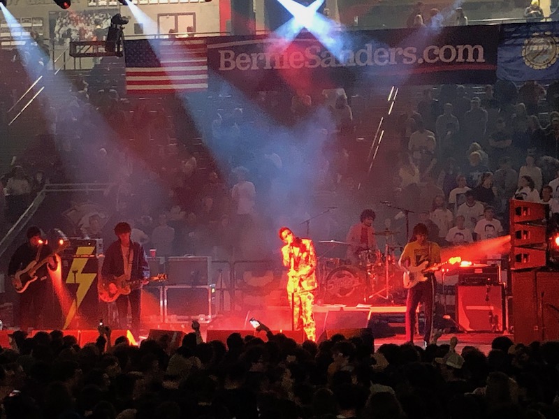 Sanders didn’t stray from his usual stump speech, but the Strokes set offered some surprises, starting with the set decoration. Sanders’s name was emblazoned on Fabrizio Moretti’s bass drumhead in the style of the Strokes logo, and guitarist Albert Hammond Jr. was rocking a Bad Brains t-shirt that, none too subtly, showed a lightning bolt striking DC’s capitol building. To that end, the band kicked things off with a cover of the Talking Heads’ “Burning Down the House,” during which Casablancas called for the crowd to “give it up for the senator, Bernie Sanders. Where did he go? I think he’s gone.”