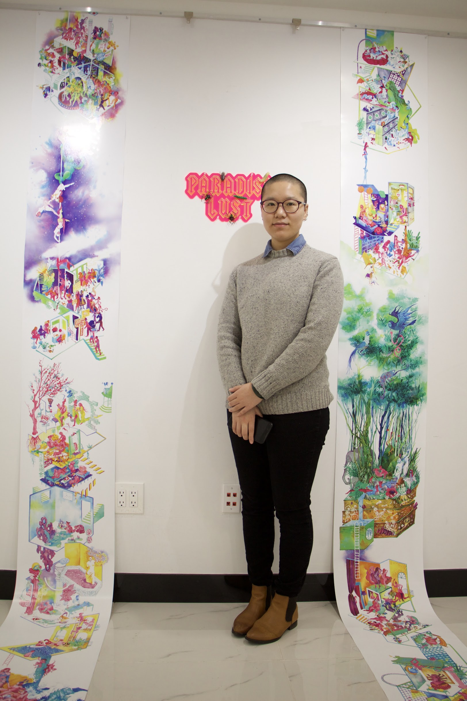 In New York, Ma enjoys greater freedom of expression and surrounds herself with queer and Asian friends. Her 300-inch-long hanging scroll, “Paradise Lust,” portrays a cross section of a building where each floor is a multicolored world screaming with erotic fun and pleasure. “In China, people have a clear definition for what male and female should be like. Transgenders are [widely regarded as] perverts,” Ma explained. “I intentionally painted them in different gender: transgender, male, female, queer. Because they’re all mixed together, you won’t notice that it’s two guys together, or two girls together. They are all normal human beings.”
