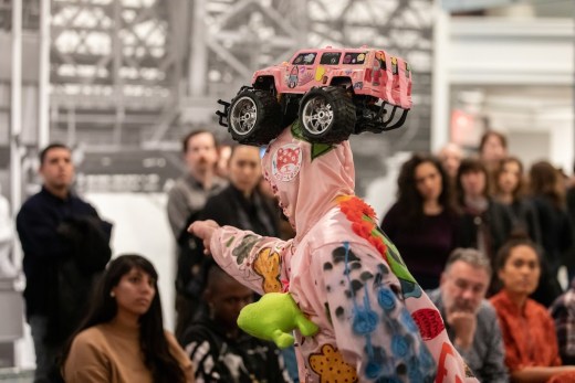 You may have never seen live dance in a museum. But on the first Saturday of March, visitors flocked to Brooklyn Museum’s Great Hall to watch Christopher Unpezverde Núñez dance while wearing red long johns and a pink hoodie painted with pop art: Andy Warhol’s banana peel, a green alien, Rufino Tamayo’s pink and green fishes, Florentijn Hofman’s rubber duck and a green skull with red curly hair. Sewn into the hoodie were several toys that were reminiscent of his nieces and his dogs.