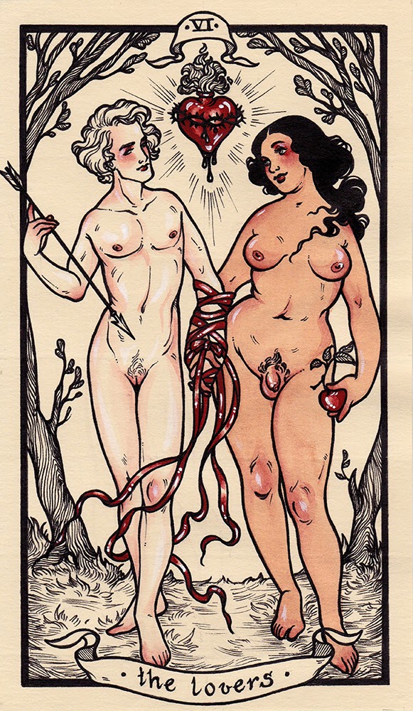 Pavlov’s deck puts a twist on the original Rider-Waite deck, created by Pamela Colman Smith more than a century ago. She painted the ‘The Lovers’ card with a male and a female figure clasping hands together— a symbol of union or togetherness, like reaching a higher state of self by being with another person or partnering with somebody. But in Fyodor Pavlov’s tarot deck, the two figures are trans.