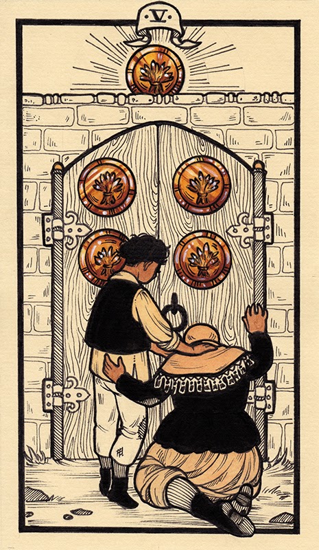 Pavlov has also tried to incorporate imagery that’s relevant to the current political climate, as in the “Five of Coins” card. The card traditionally depicts a couple of poor folks outside of a church seeking refuge during hard times, whether it be financial or interpersonal hardship, or some sort of loss. The idea here is that the church offers solace, but Pavlov thinks that is no longer a universal concept. “A lot of people don’t have religious affiliation or they don’t look to the church as a force for good or a force for comfort,” he said. “But the idea of being shut out of somewhere, the idea of not being given the opportunities that you would like to have, is what’s at the core of the card.”