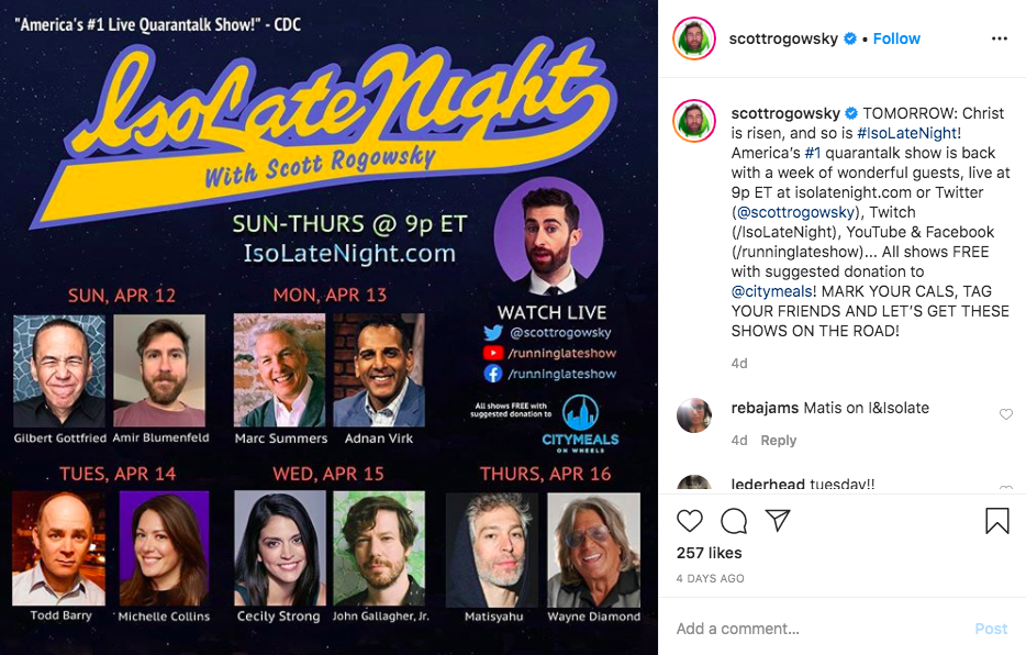 Even during quarantine, late night shows haven’t stopped. Sure, it’s a little weird to see them outside of their glossy studio setting, but the show must go on, I suppose. Not only that, but new late night shows have cropped up, giving hosts the chance to virtually correspond with guests from anywhere in the world. Scott Rogowsky (perhaps best known from his stint as the “quiz daddy” of HQ Trivia) hosts IsoLate Night four nights a week, streaming silliness on whatever platform you prefer. Past guests have included Gilbert Gottfried, Todd Barry, Cecily Strong, actor/musician John Gallagher Jr., and the tan and charismatic Wayne Diamond, who you may have seen in Uncut Gems (throwback to when movie theaters were a thing!).