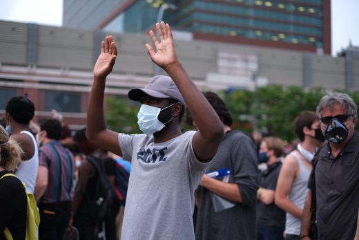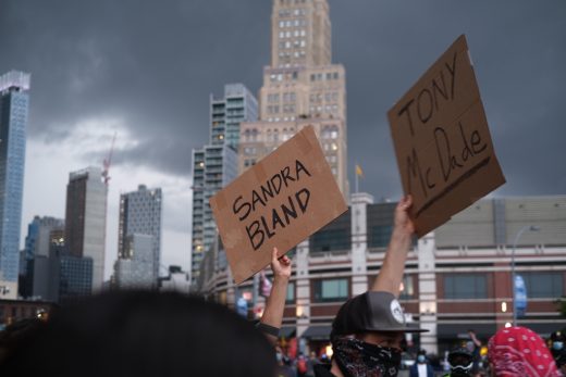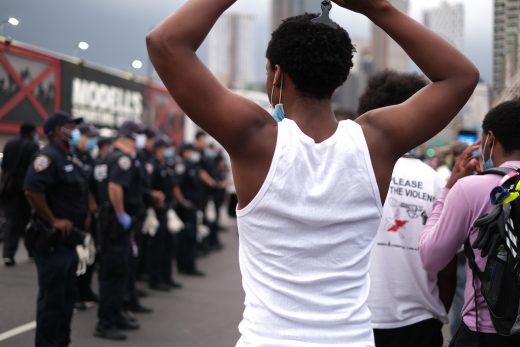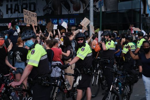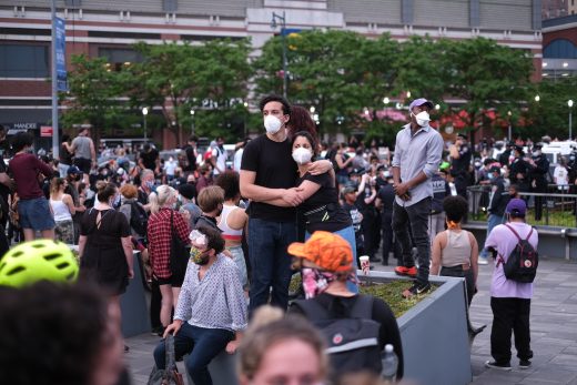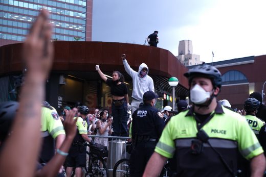 During a third night of nationwide protests following the killing of George Floyd, a 46-year-old unarmed black man in Minneapolis, New York City protesters gathered at Barclays Center in Brooklyn. The demonstrations started peacefully at 6pm, but ended in clashes between protesters and the police. The photos in the above slideshow were taken from 6pm to 9pm; as of publication around midnight, altercations between demonstrators and police were ongoing throughout Brooklyn.