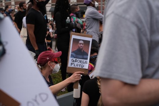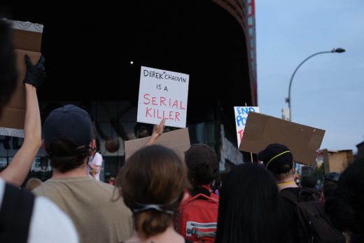 The first hours of the protest were largely comprised of protesters holding signs that read “Black Lives Matter” and “I can’t breathe,” and depicted the image of George Floyd, who died after officer Derek Chauvin held a knee to Floyd’s neck for over eight minutes on Monday night. Organizers discussed the third-degree murder charges leveled against Chauvin on Friday afternoon, and lauded the efforts of the protesters and organizers. Police surrounded the area, packed into the side streets around Barclays Center.