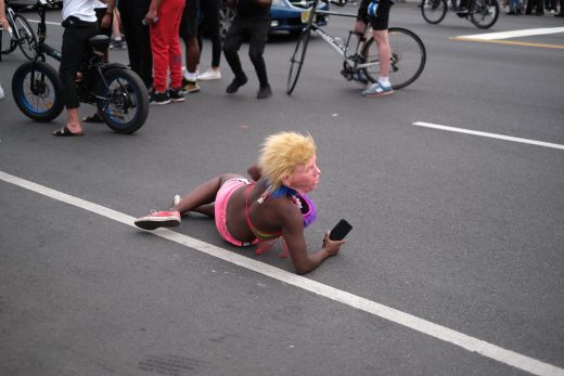By nightfall, a police car had been briefly lit on fire, and the window of a police SUV smashed on Fifth Avenue. Protesters began to disperse, challenging the NYPD in the streets branching off of Barclay’s Center. The violence rapidly spread throughout the borough. Protesters advanced on the 88th Precinct at Classon and DeKalb Avenues, and a tweet from Myles N. Miller of NBC News showed a police van on fire. The footage also showed at least 4 people being led away from the precinct in a handcuff chain.