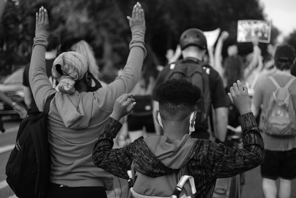 Throughout Sunday evening, white-clad protesters could be seen throughout the streets of Brooklyn, and many stayed in Fort Greene Park through sunset. On blocks around the park, ad-hoc organizers spoke from stoops, while others played music and demonstrators danced in the streets. Those that stayed in the park gathered in small groups on the lawn, their white clothes striking against the park’s green grass. In a moment when many organizers were calling for sustained momentum and bemoaning the perceived flagging energy of both protests and media coverage of them, the visible solidarity of the all-white protest Sunday was a reminder of just how strong and widespread this movement continues to be.