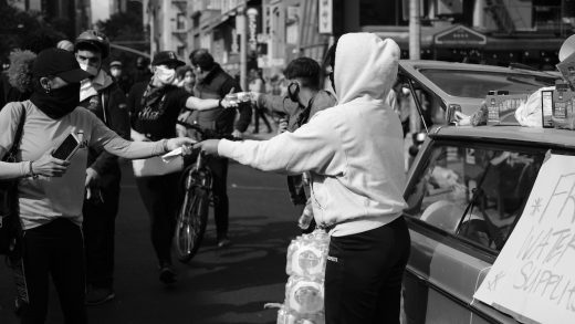But by the time last night’s hastily imposed 11pm curfew fell, some areas of the city had already devolved into a cat-and-mouse game between police officers and looters. In midtown, several luxury retailers were attacked. Bedford + Bowery witnessed a small group pulling the plywood off of the storied Bergdorf Goodman department store and smashing its front window with a hammer. Downtown, the East Village was once again subjected to looting, with the windows of a Starbucks, FedEx Office, and the Gap smashed along Astor Place.