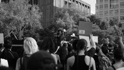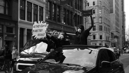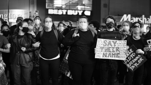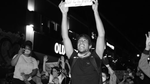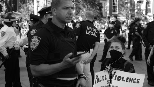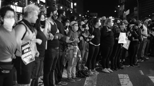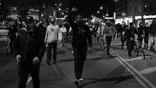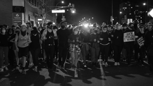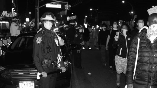 At 10:40pm, 20 minutes before the New York curfew, organizers joined the crowd in a moment of silence, followed by chants of George Floyd’s name. They urged protesters to go home, to rest, and to avoid arrest as a result of the curfew. Five minutes before the curfew, a group of protesters coming from a silent vigil in McCarren Park in Williamsburg joined the group and an organizer led the crowd in chants of “Hands up, don’t shoot” as the clock struck 11.