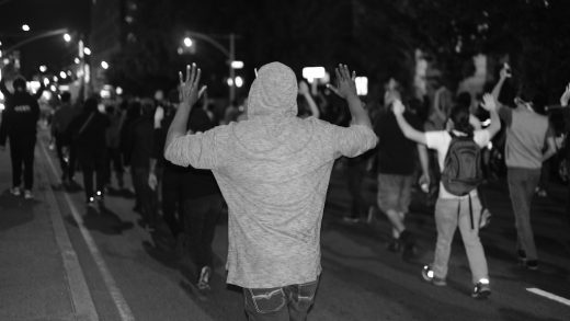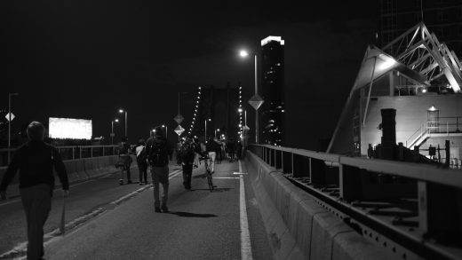 As the protesters approached a barricade that had just been erected across Atlantic Avenue, they, one by one, began to kneel with their hands raised in front of the police vans and continued to yell “Hands up, don’t shoot,” in the face of the police lights. By 11:20, the police cleared the barricade, and allowed the protesters to continue on to Flatbush Avenue, towards the Manhattan Bridge. The mood was victorious, with demonstrators playing “Fuck Tha Police” as they made their way north across the bridge.
