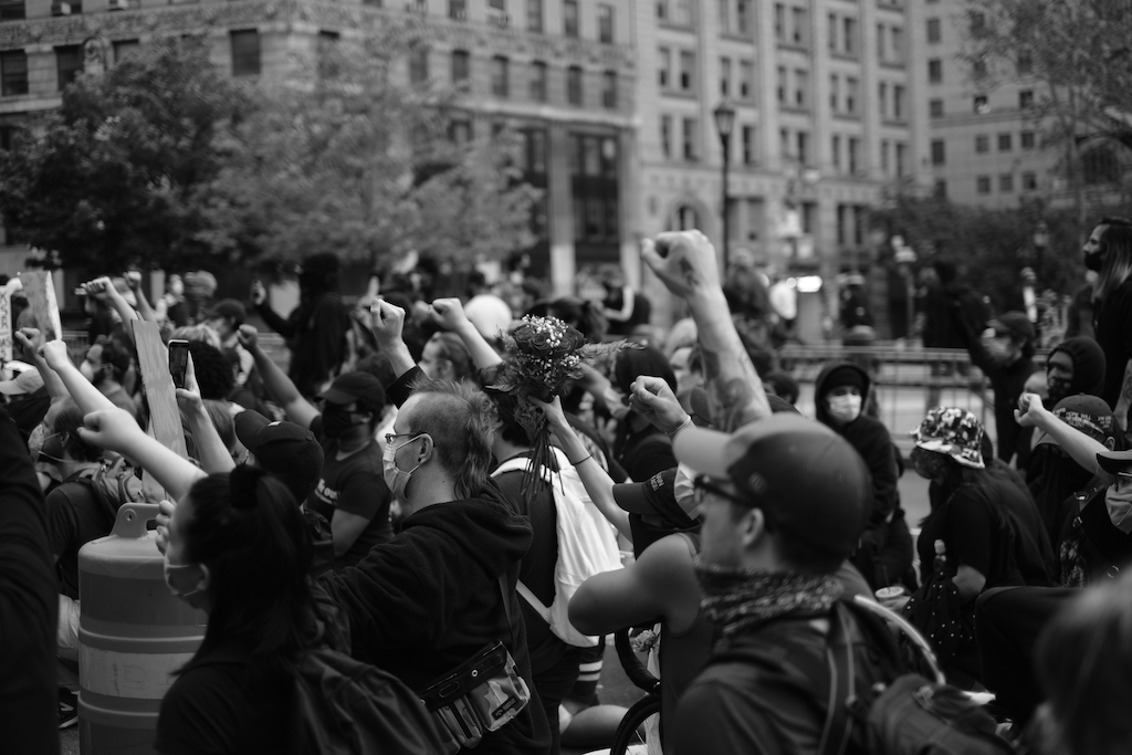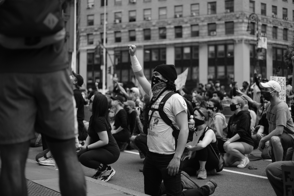 At the steps of the New York County Courthouse, a black man kneeled with his hands in the air in front of police officers stationed there, as crowds behind him did the same and put fists into the air in the symbol of Black Power.
