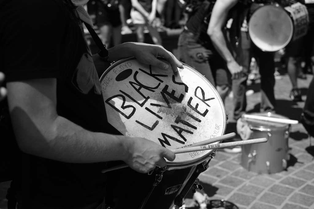 A drum line played in the center of the park’s dried-out fountain, while (primarily white) picnickers looked on and the crowd, dressed in black, grew in size. Organizers emphasized the importance of white allyship in the protest movement, particularly in a system that has demonstrated its care for white bodies over Black ones.