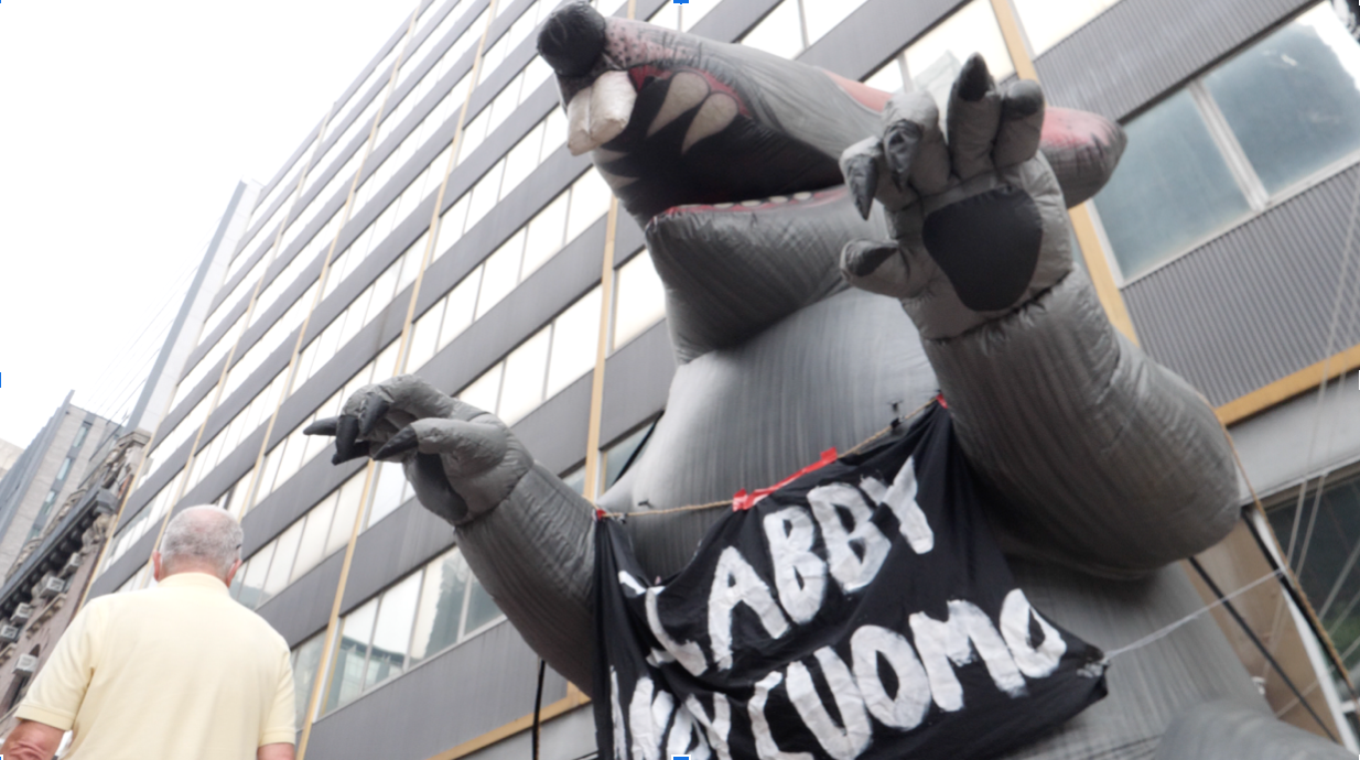 The first protester to arrive and the last to leave was Scabby, the giant inflatable rat usually used by unions to protest against companies. This Tuesday, Scabby had a flag in his belly with another name: Andrew Cuomo. “The governor is refusing to give the release the tenants need to cancel the rent and prevent evictions,” said Jeremy Bunyaner, representing the Association of Legal Aid Attorneys. “And right now, this is how Cuomo looks to the tenant’s movement, to say the least,” said Bunyaner, pointing at the rat.