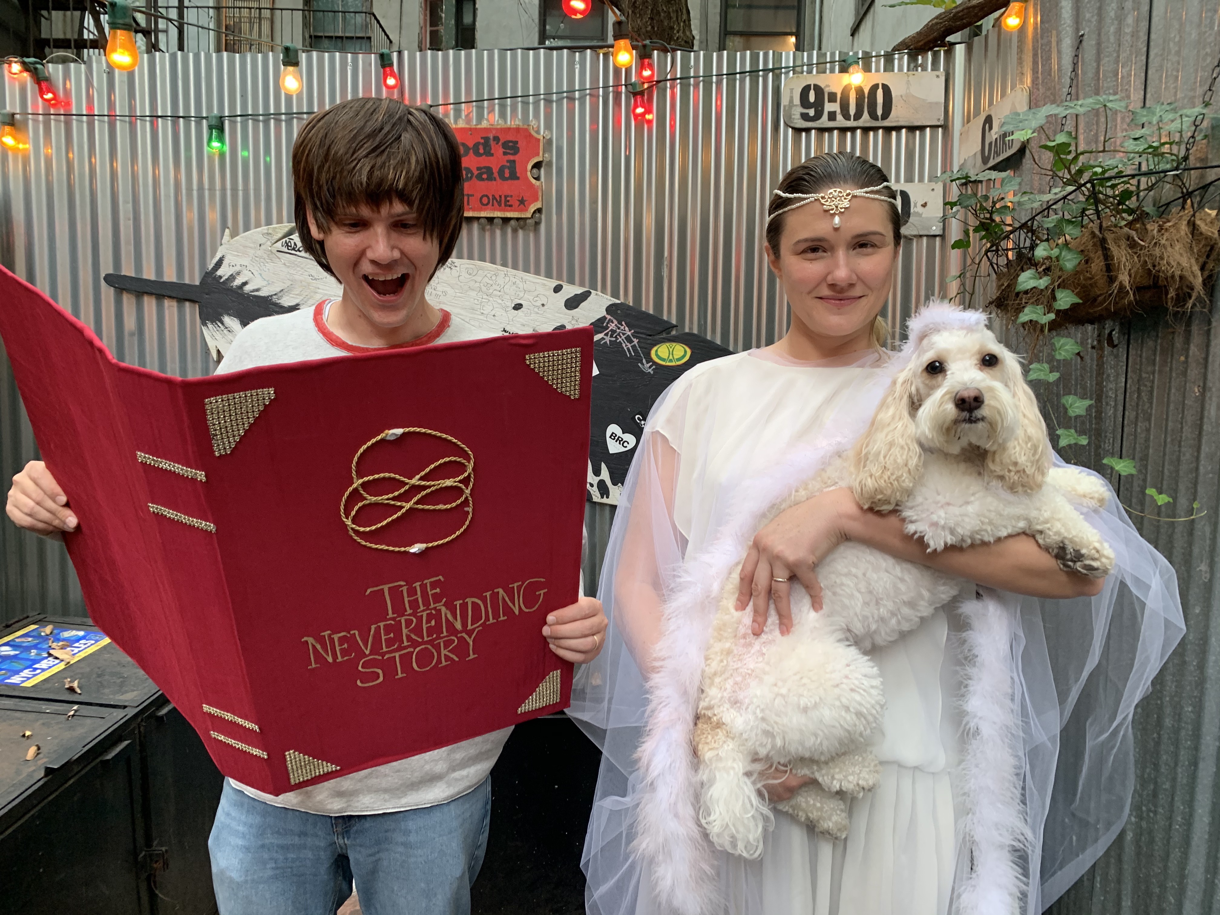 “Participating in this is just really keeping spirits alive,” said Natalie Weiss, who was dressed as the childlike empress from The NeverEnding Story, the popular ‘80s fantasy film. By her side, her partner Bob Jones held a massive homemade version of the red storybook and her cockapoo Ziggy, sitting pretty in a pink feather boa, played the Luck Dragon. Weiss was one of the few participants who attended the event in the open-air back patio at Lucky on B, a dive bar located steps away from Tompkins Square Park.
