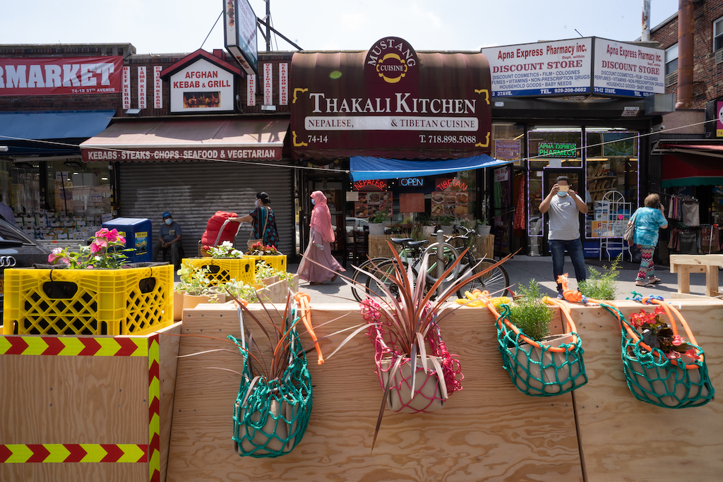For example, a collaboration in Queens with 82nd Street Partnership (a community advocacy group in Jackson Heights) helped revitalize businesses struggling due to COVID-19 restrictions. One such business, Thakali Mustang Kitchen, a Tibetan and Nepalese restaurant, was on the brink of closure because they had no outdoor seating and take-out traffic was waning. The Neighborhoods Now team intervened with blueprints for outdoor seating and sidewalk barriers sporting hand-crafted planters. The report states: “[The Kitchen] was able to apply for the permits and subsequently we spent one Saturday installing sidewalk barriers and plantings. Before we could finish the installation, tables were set up and patrons sat down immediately.”