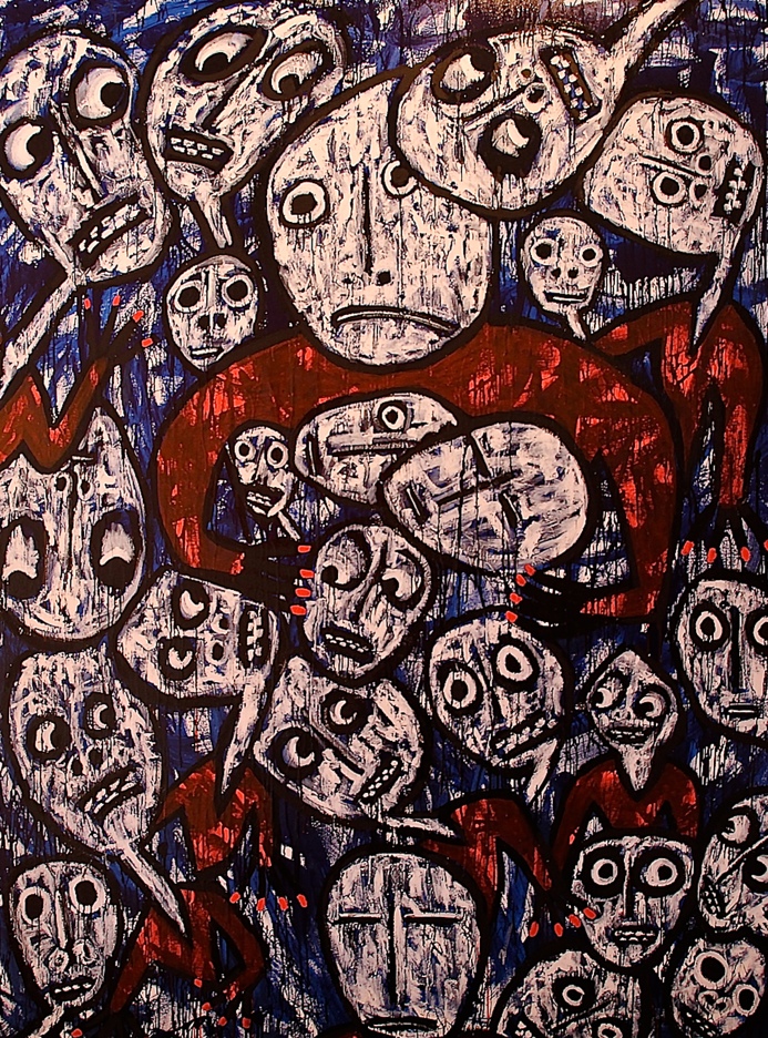 “It’s Boring to Die, by Swedish artist Johan Wahlstrom, is a series that embodies XX large, acrylic and ink canvases filled with graphic, naïf heads and torsos in a dark, limited palette of greys, blues, black and blood-red accents. The provocatively titled pieces are social critiques, reflecting the artist’s grapplings with a world of extreme polarities.” – Van Der Plas Gallery. Exhibit on view until July 29th.
